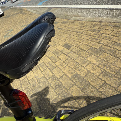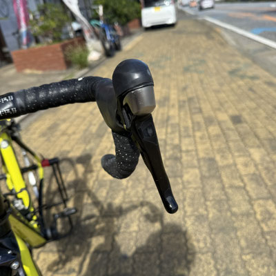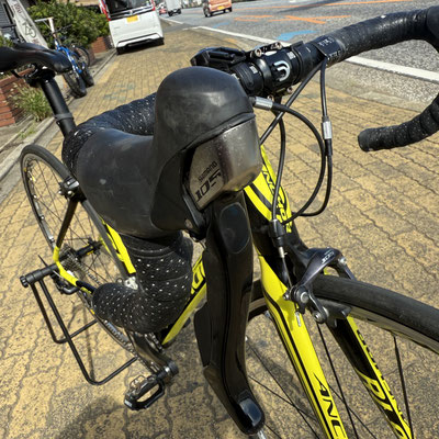 コラムはベタでカット、ブレーキは左前、右後ろ、シートポストはワンバイエスのカーボンシートポストに変更、Di2のジャンクションAの取付マウントのつめが破損したため、タイラップで取付をしております。