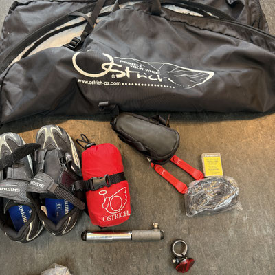 車体のほか、輪行袋、ホイールバッグ(いずれもOSTRICH)、サドルバッグ(パンク修理キット)、リアライト、携帯ポンプなど付属品としてお付けいたします。