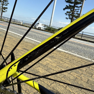 キックスタンドを取り付けていた際にできたキズ、色染みが左チェーンステーにあります。